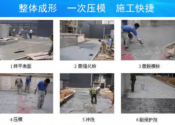 4、撒布脫模粉:在硬化資料初凝一定階段,外表枯燥無明顯水份的狀況下平均撒布一層與硬化資料配套 的脫模粉。